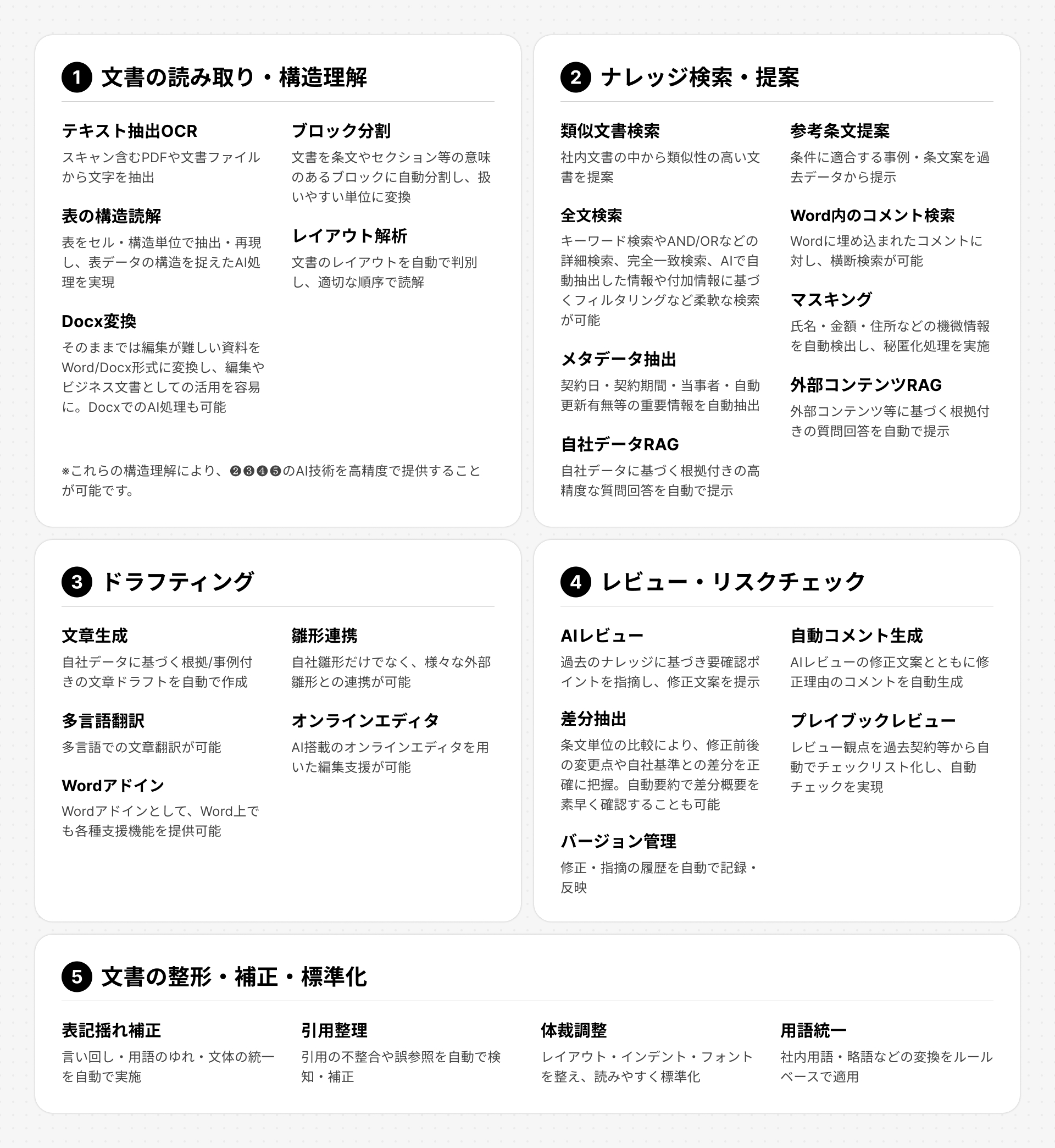 「FRAIM」はこれまで、契約書・規程・社内文書といった企業文書を対象に、積極的な技術開発やサービス運営を通じて、独自の文書処理基盤を構築してきました。主力サービスの「LAWGUE」は、2018年からサービスを展開し、様々な企業・士業・官公庁等の文書作成・レビュー・ナレッジ活用を支援して参りました。「FRAIM AI Agent」は、支援実績に基づく専門知と技術資産を“手足”として自在に組み合わせて活用できる、実務現場に最適化されたAIエージェントです。