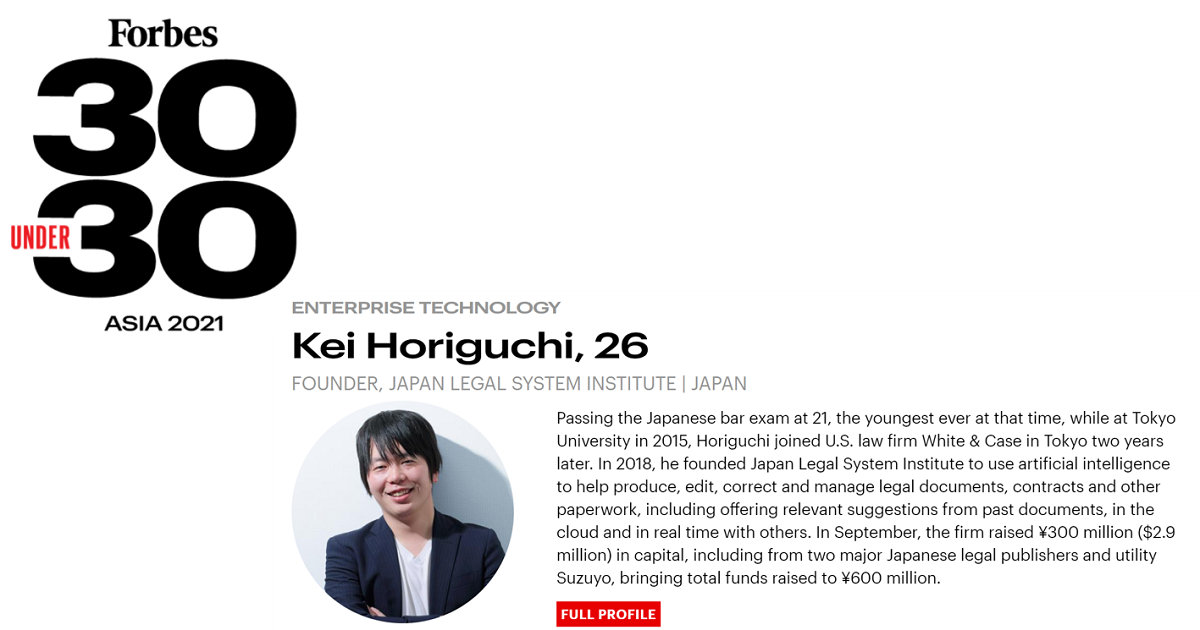 堀口は東京大学在学中の2015年、当時史上最年少の21歳で司法試験に合格し、2年後に米国法律事務所ホワイト&ケースの東京拠点に入社。2018年に、人工知能を使用して法的文書、契約書、その他の書類の作成、編集、修正、管理を支援する日本法務システム研究所を設立。同社がクラウド上で提供するサービスは、過去文書をもとに関連する提案をAIがリアルタイムに提供する。9月には、第一法規、新日本法規出版、鈴与、AIinsideなどから3億円の資金を調達している。(原文和訳・補記)